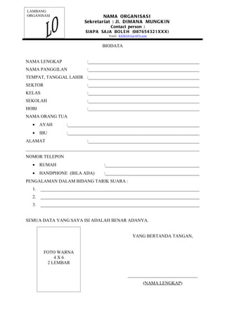 Biodata ini memperlihatkan tingkat pendidikan sang murid yang biasanya harus disediakan sebelum mendaftarkan diri ke institusi pendidikan di. Penerima seterusnya adalah seorang yang sangat tegas dalam menjalankan tugas. Biodata adalah sebuah dokumen yang berisi data diri seseorang yang ditampilkan secara rinci.